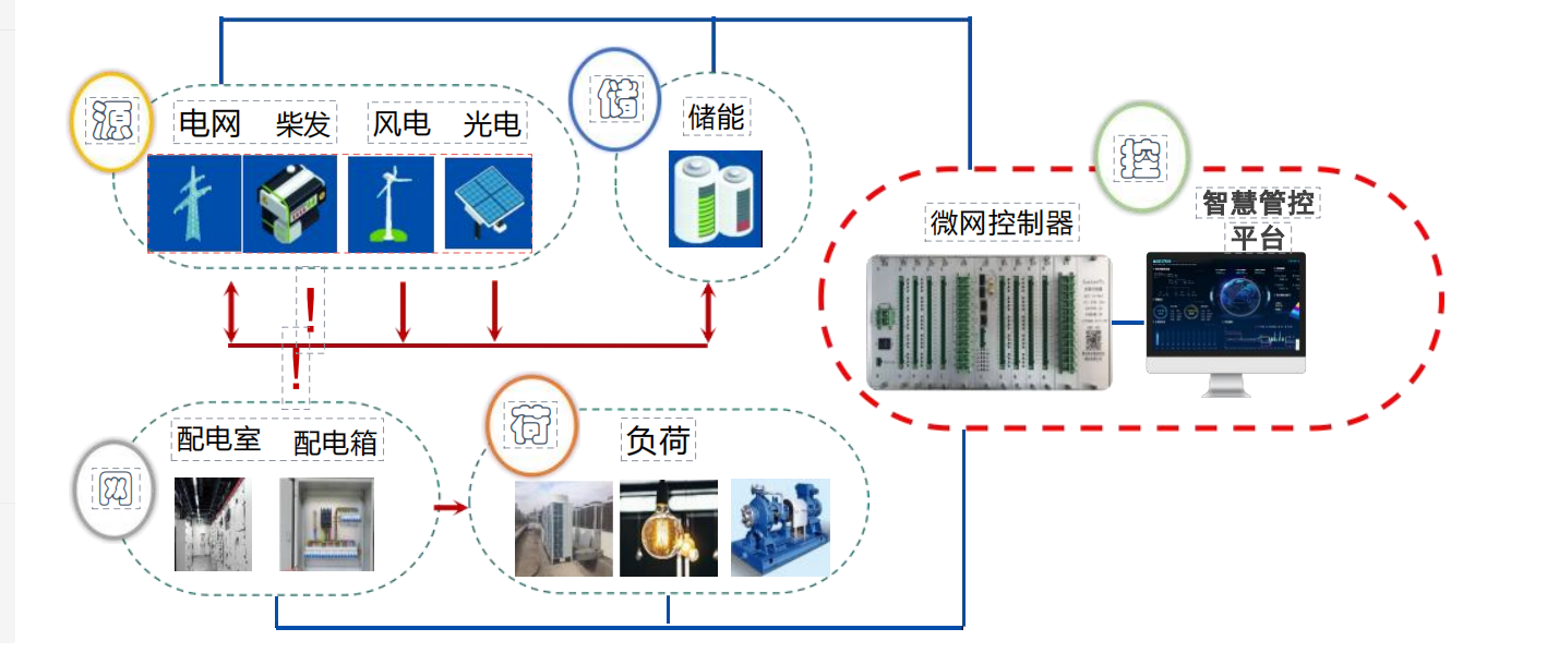 智能微電網:由源(分布式電源)、網(配電網絡)、荷(負荷)、儲能及控制系統構成的小型電力系統,能夠實現自我控制、保護和管理的自治電力系統,既可以與外部電網并網運行,也可以孤網運行。